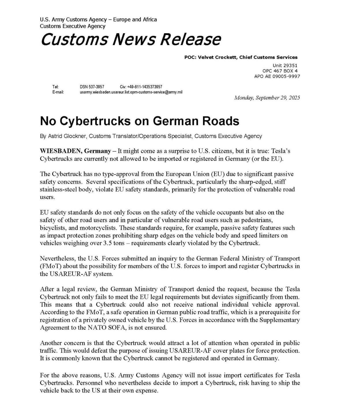 Normal şartlarda ABD ordusu mensupları, NATO anlaşmaları kapsamında Avrupa’ya getirdikleri araçları muafiyetle kullanabiliyor. Ancak Alman makamları, Cybertruck’ın güvenlik gerekliliklerinden o kadar uzak olduğunu belirtti ki bu kez muafiyet uygulanmadı. Yani ABD Ordusu bile Almanya’da Cybertruck’ı yollara çıkaramayacak.